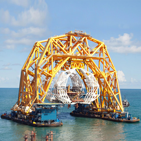 Transport of offshore renewables structures such as jackets, piles, monopiles, transition pieces, towers, nacelles, hubs, blades, substations etc. from the marshalling port or the fabrication site to the installation location offshore and installation of such structures.